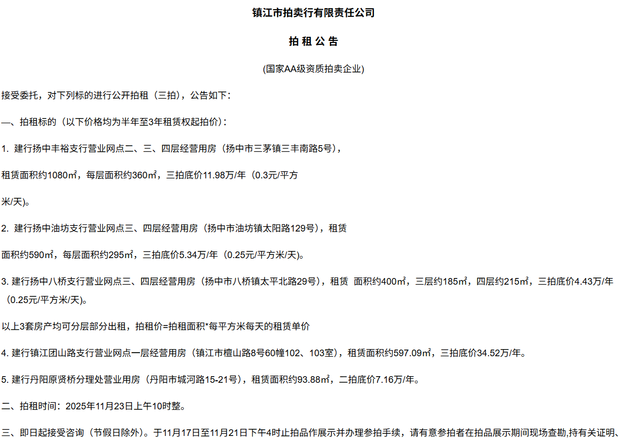 鎮江市拍賣行有限責任公司拍 租 公 吿(國家AA級資質拍賣企業)接受委托,對下列標的進行公開拍租(三拍),公告如下:—、拍租標的(以下價格均為半年至3年租賃權起拍價):1.  建行揚中豐裕支行營業網點二、三、四層經營用房(揚中市三茅鎮三豐南路5號),租賃面積約1080㎡,每層面積約360㎡,三拍底價11.98萬/年(0.3元/平方米/天)。2.  建行揚中油坊支行營業網點三、四層經營用房(揚中市油坊鎮太陽路129號),租賃面積約590㎡,每層面積約295㎡,三拍底價5.34萬/年(0.25元/平方米/天)。3. 建行揚中八橋支行營業網點三、四層經營用房(揚中市八橋鎮太平北路29號),租賃  面積約400㎡,三層約185㎡,四層約215㎡,三拍底價4.43萬/年(0.25元/平方米/天)。以上3套房產均可分層部分出租,拍租價=拍租面積*每平方米每天的租賃單價4. 建行鎮江團山路支行營業網點一層經營用房(鎮江市檀山路8號60幢102、103室),租賃面積約597.09㎡,三拍底價34.52萬/年。5. 建行丹陽原賢橋分理處營業用房(丹陽市城河路15-21號),租賃面積約93.88㎡,二拍底價7.16萬/年。二、拍租時間:2025年11月23日上午10時整。三、即日起接受咨詢(節假日除外)。于11月17日至11月21日下午4時止拍品作展示并辦理參拍手續,請有意參拍者在拍品展示期間現場查勘,持有關證明、簽署相關說明、繳納相應的參拍保證金辦理參拍手續。四、咨詢、拍租地點:鎮江市長江路9號五、聯系方式:0511-85275988   13655299933楊先生六、網址:http://www_zjauction_net.hlc3.com;微信公眾號:搜索“鎮江市拍賣行” 拍品清單2025.11.23序號名稱起拍價(元)標的說明1建行揚中豐裕支行營業網點二、三、四層經營用房(揚中市三茅鎮三豐南路5號),租賃面積約1080㎡,每層面積約360㎡三拍底價11.98萬/年(0.3元/平方米/天)1、1-3號房產均可分層部分出租,拍租價=拍租面積*每平方米每天的租賃單價;2、意向競拍人在拍賣前需持營業執照或身份證與委托方說明租賃房產經營業態,確定意向后出具房產承租用途承諾書,經委托方審核后,方可交納保證金參加競拍;3、租賃期限為半年至3年(承租方與出租方協商而定),承租方每半年或一年結付租金,租賃期間的水、電費用及其它相關費用均由承租方承擔;4、承租方不得用于經營和保管危險物品,不得用于開設餐飲、娛樂等可能嚴重影響消防安全、運營安全的經營業態,不得用于經營委托貸款、小額貸款等可能冒用委托方名義,帶來聲譽風險的經營業態。租賃期內,承租方不得破壞墻體結構,自行成就消防、安全等使用條件,不得擅自將租賃房屋轉租、轉讓給他人使用,否則委托方有權收回房屋;5、拍租成交后,承租方將租金交至出租方指定賬戶,傭金交至拍賣方賬戶(拍租傭金為該房屋一個月租金)。承租方憑租賃合同無息退還保證金。2建行揚中油坊支行營業網點三、四層經營用房(揚中市油坊鎮太陽路129號),租賃面積約590㎡,每層面積約295㎡三拍底價5.34萬/年(0.25元/平方米/天)3建行揚中八橋支行營業網點三、四層經營用房(揚中市八橋鎮太平北路29號),租賃面積約490㎡,每層面積約245㎡三拍底價4.43萬/年(0.25元/平方米/天)4建行鎮江團山路支行營業網點一層經營用房(鎮江市檀山路8號60幢102、103室),建筑面積約597.09㎡三拍底價34.52萬/年5建行丹陽原賢橋分理處營業用房(丹陽市城河路15-21號),建筑面積約93.88㎡二拍底價7.16萬/年